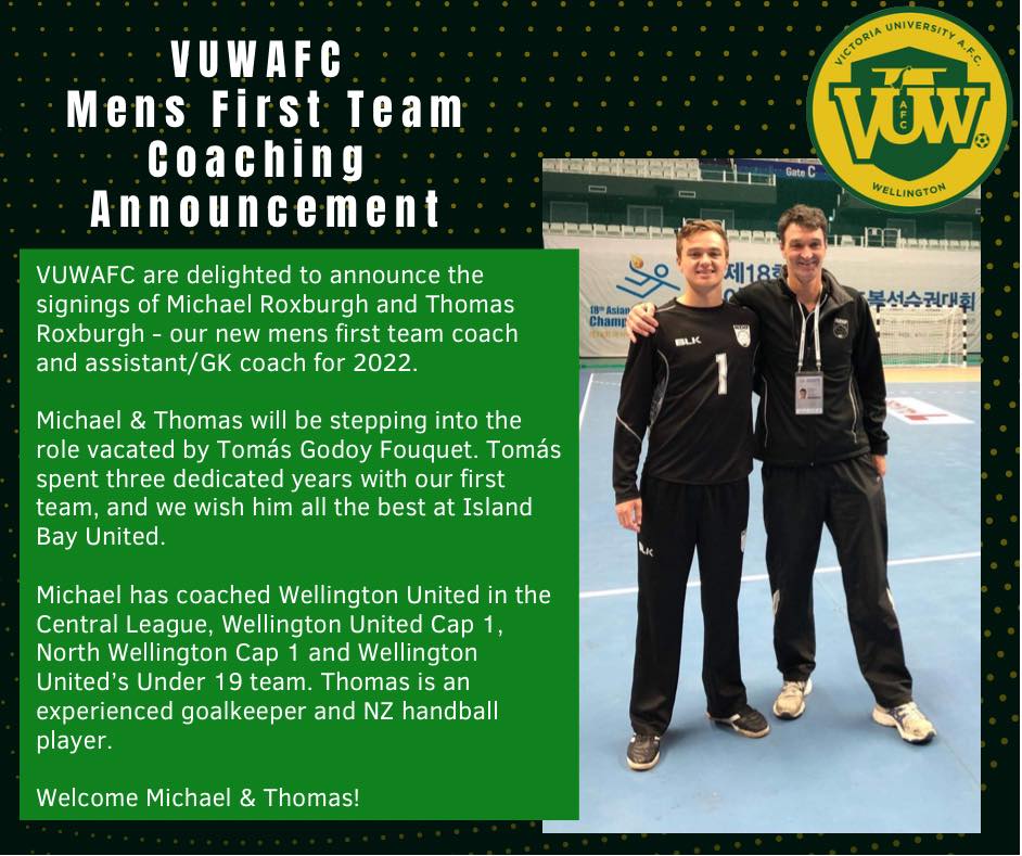 VUWAFC are delighted to announce the signings of Michael Roxburgh and Thomas Roxburgh – our new mens first team coach and assistant/GK coach for 2022.